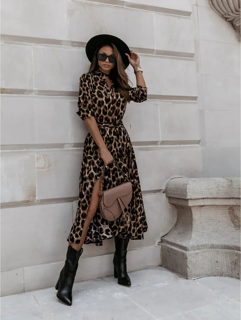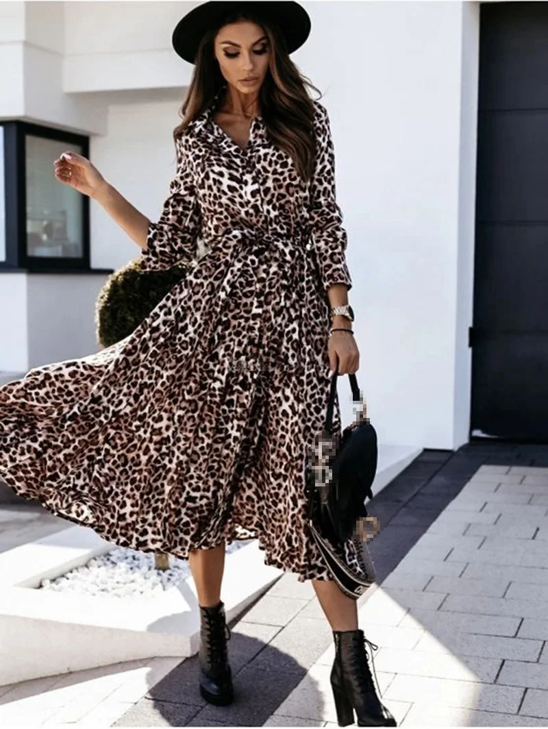 Unleash your fierce side with this stunning leopard print dress! Featuring a flattering V-neck, lace-up waist detail, and elegant A-line silhouette, this mid-calf dress is the perfect blend of street style edge and timeless elegance. The waist-cinching design creates a beautiful hourglass shape, while the long sleeves make it perfect for autumn and winter wear!