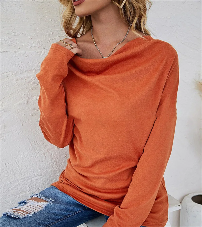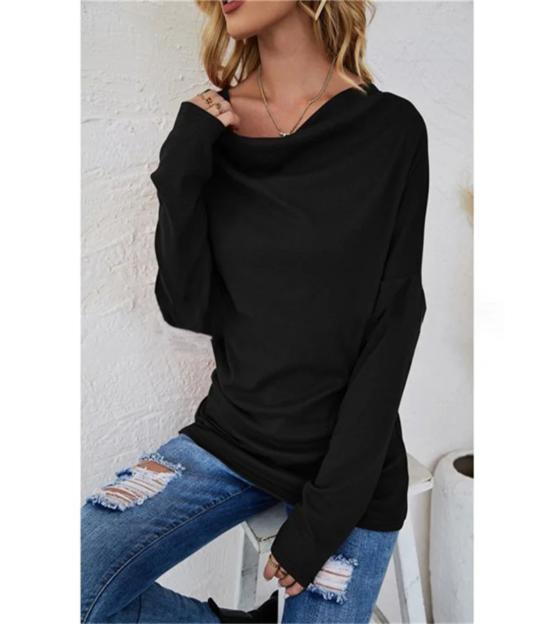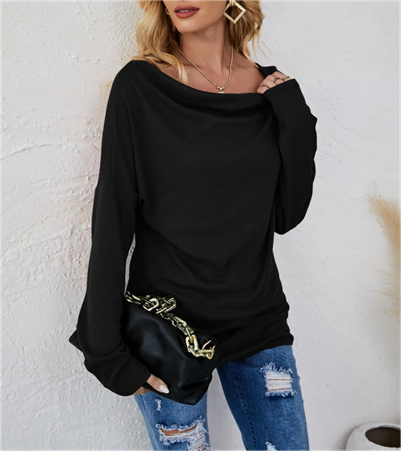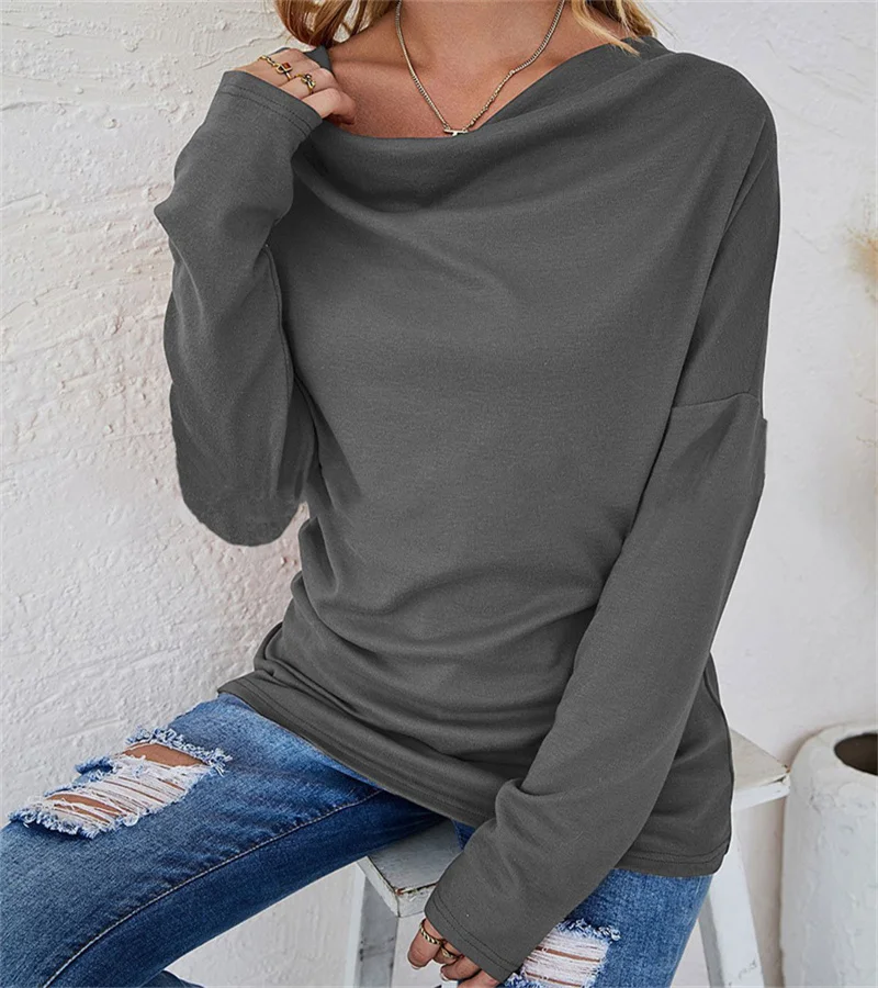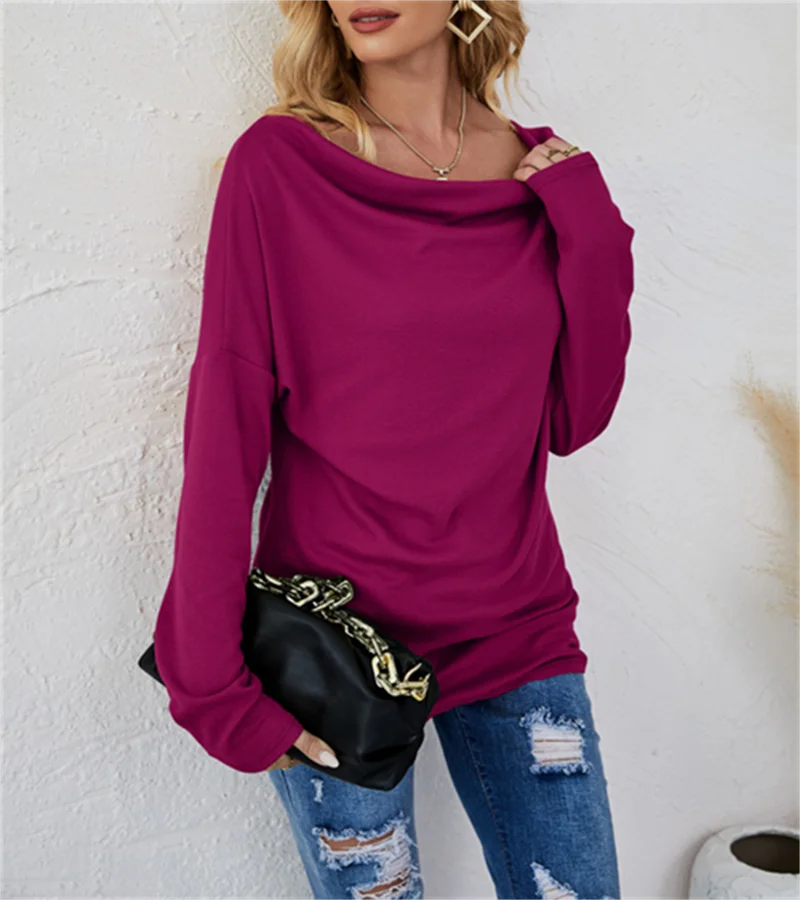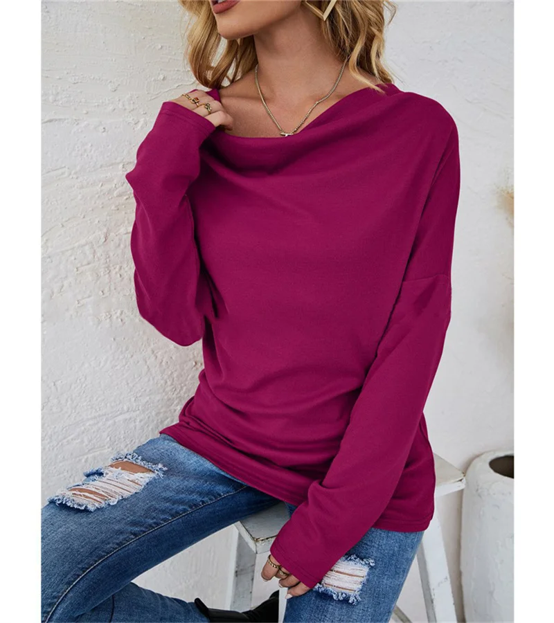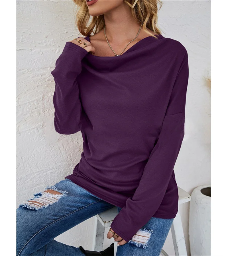 European women's long-sleeved fashion solid colour loose round-necked shirt. S-2X
