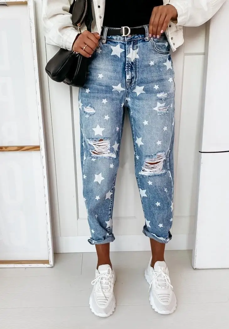 Women's High Waist Straight Leg Jeans - Ripped Denim with Star Pattern