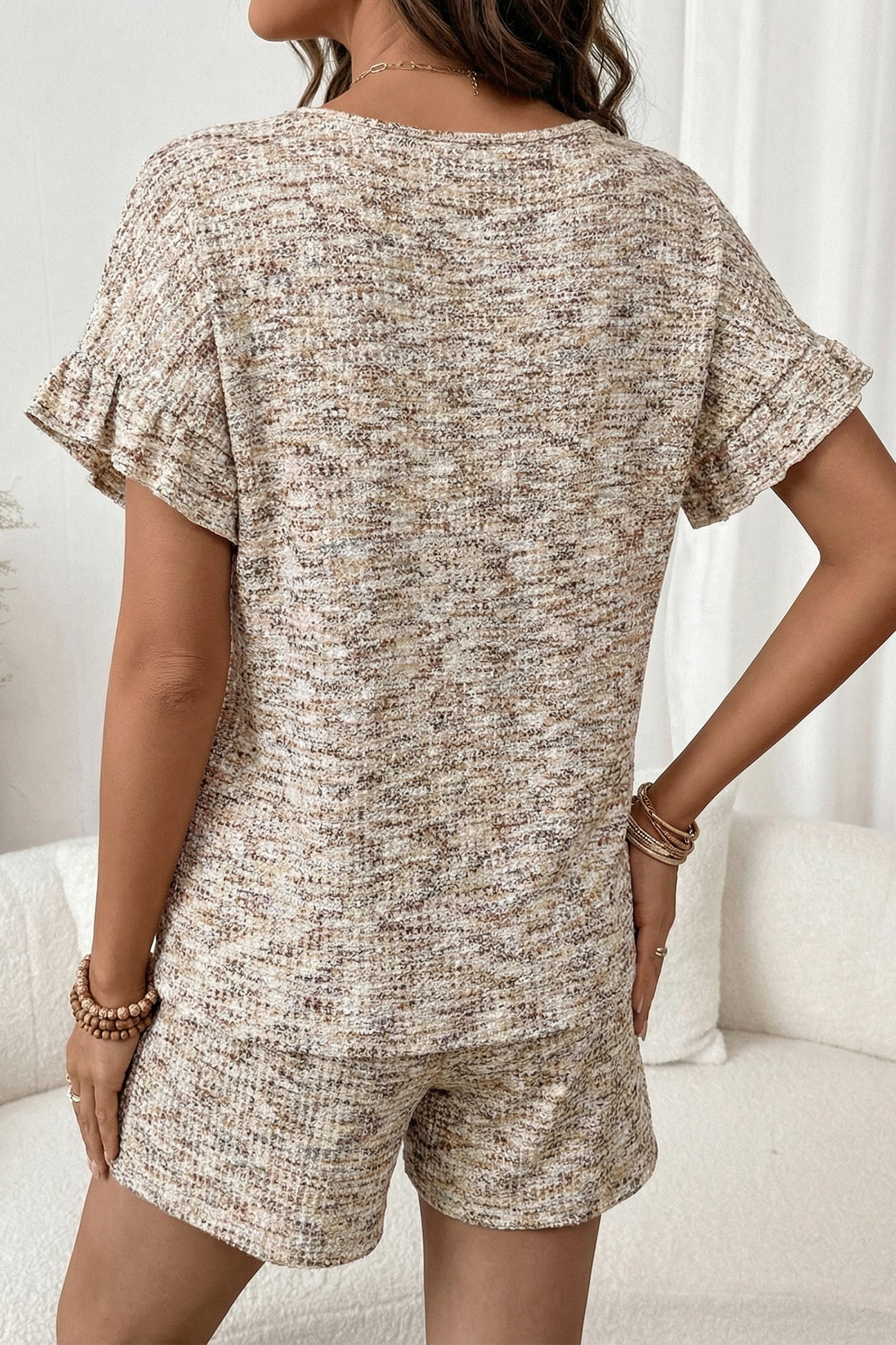 🧵 Khaki Heather Textured Ruffle Sleeve Top & Drawstring Shorts Set