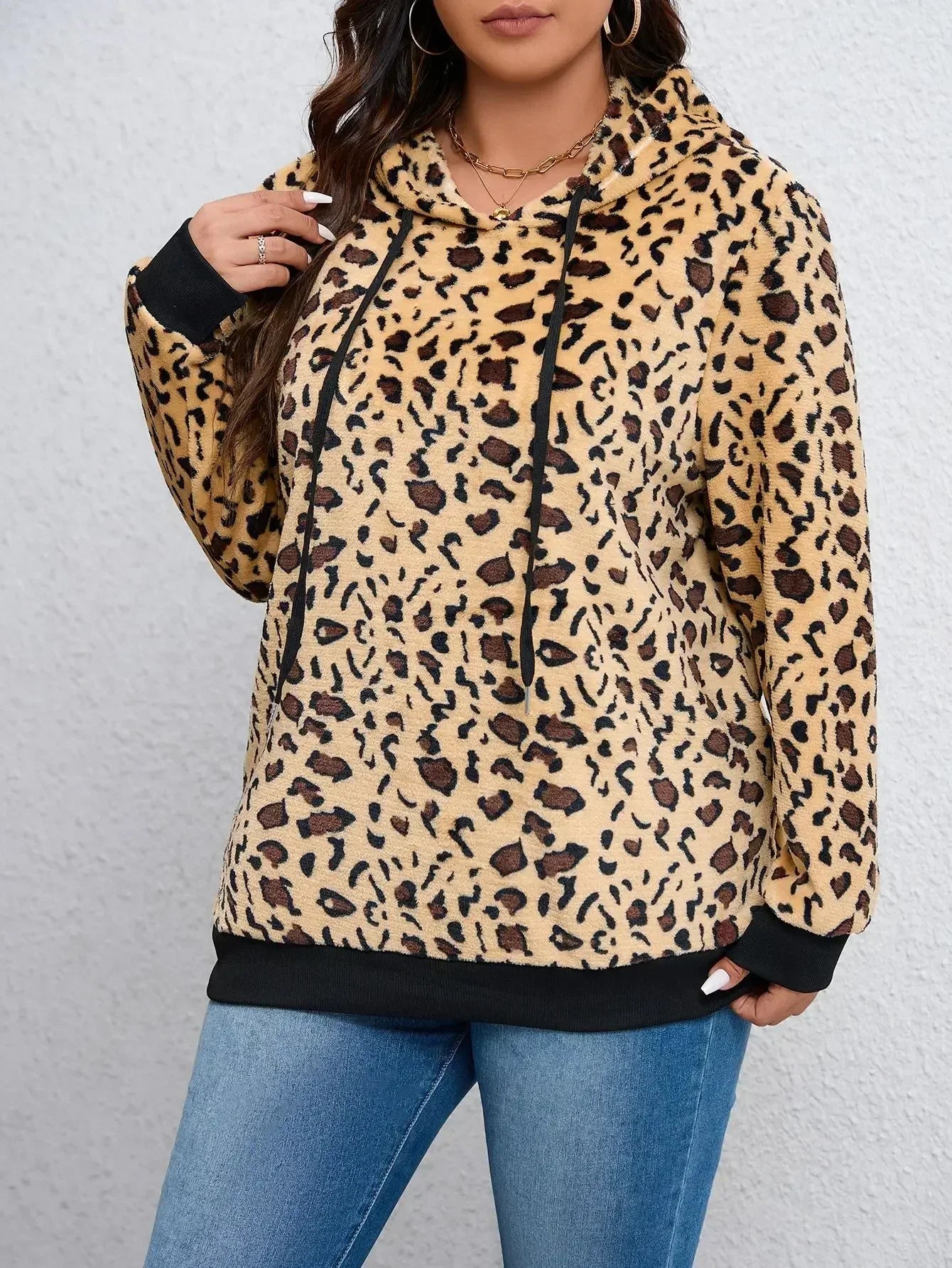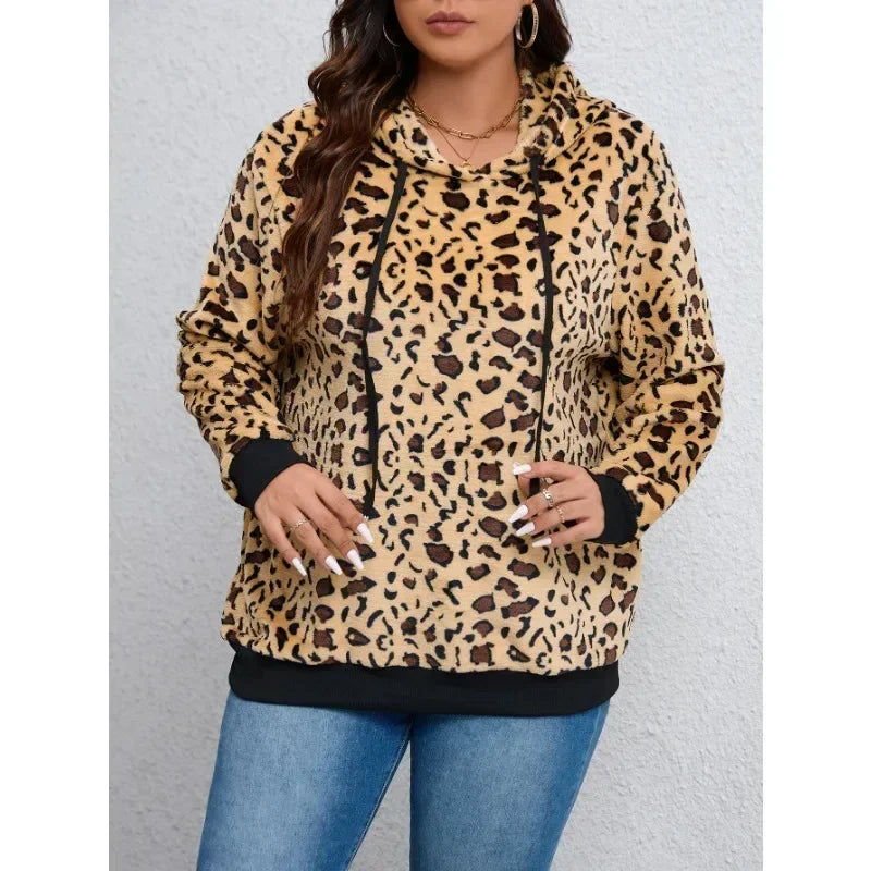 Plus Size Leopard Print Hooded Top - Women's Long Sleeve Hoodie (1X-5X)