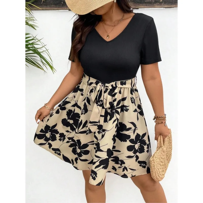 Plus Size V-Neck Party Dress - Waist Strap Patchwork Casual Dress