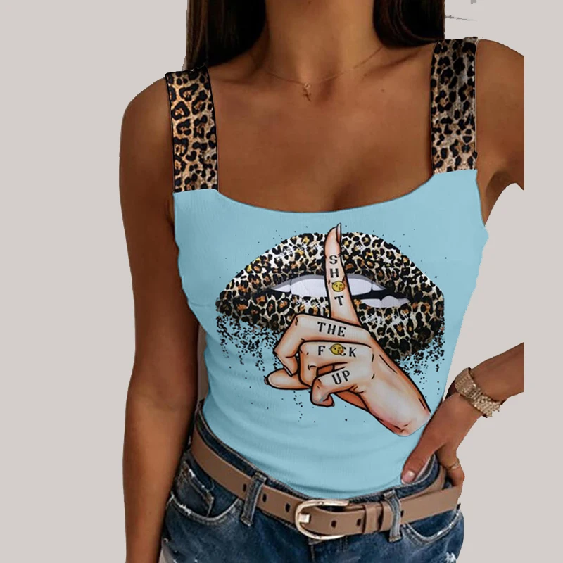 Women's Leopard Lips Print Sleeveless Top. S-3xL