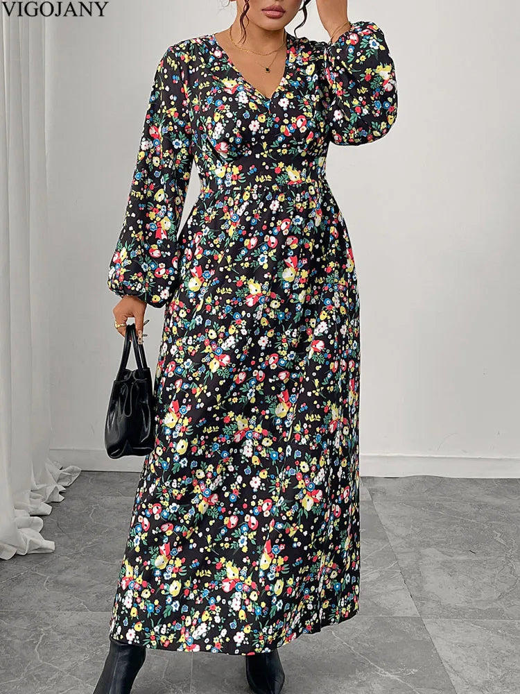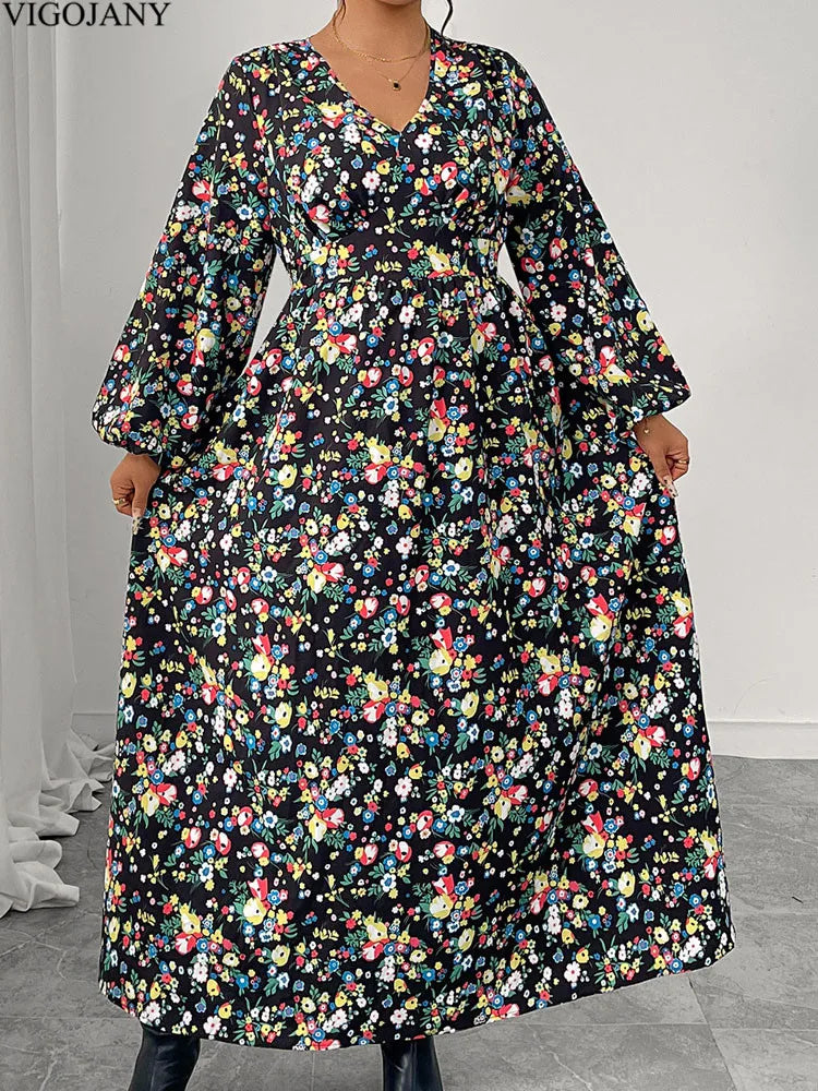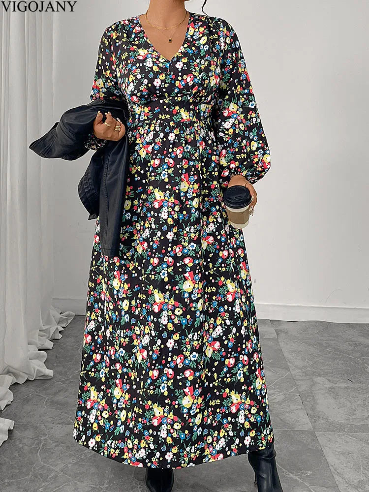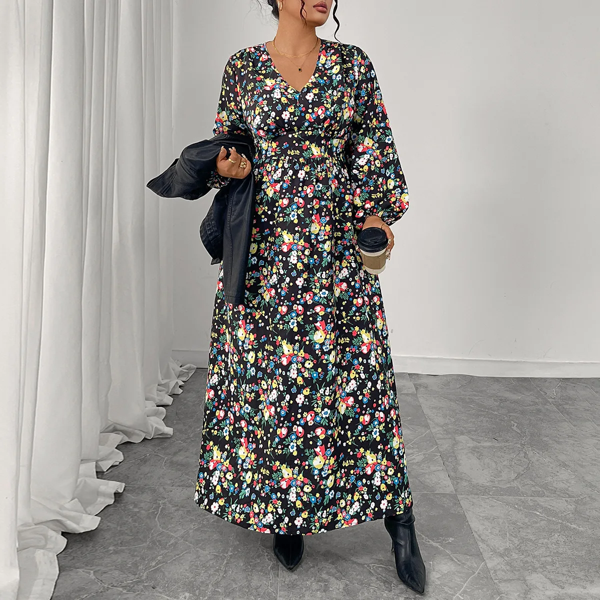 2025 Plus Size Casual Print Dress - V-Neck Long Sleeve Curvy Fit & Flare XL-3X