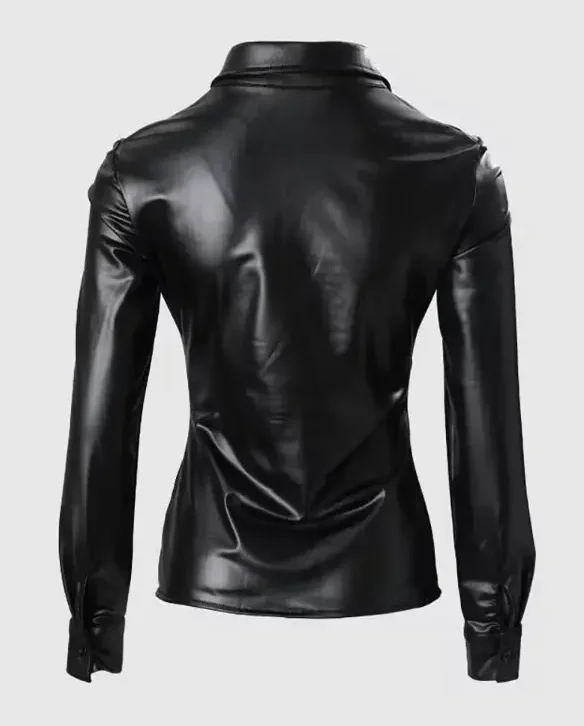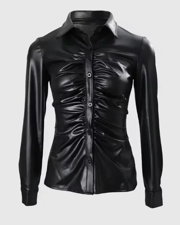 Women's Faux Leather Button Front Shirt with Ruched Lapel Collar Stylish and Comfortable Long Sleeve Top