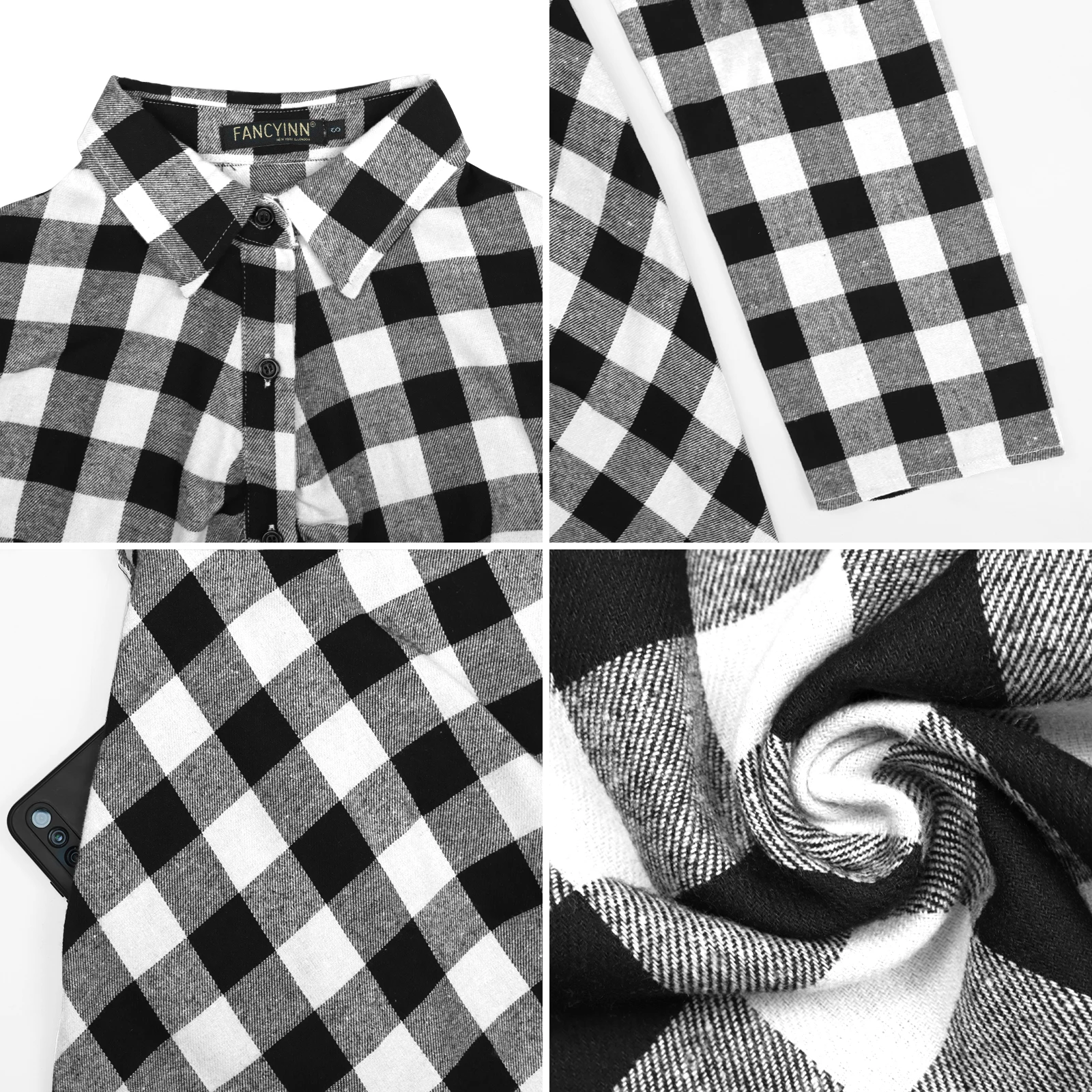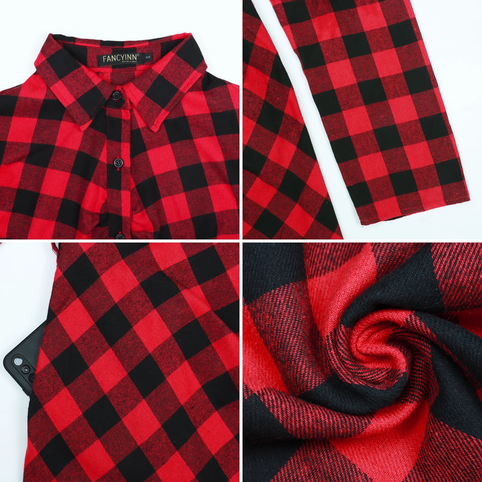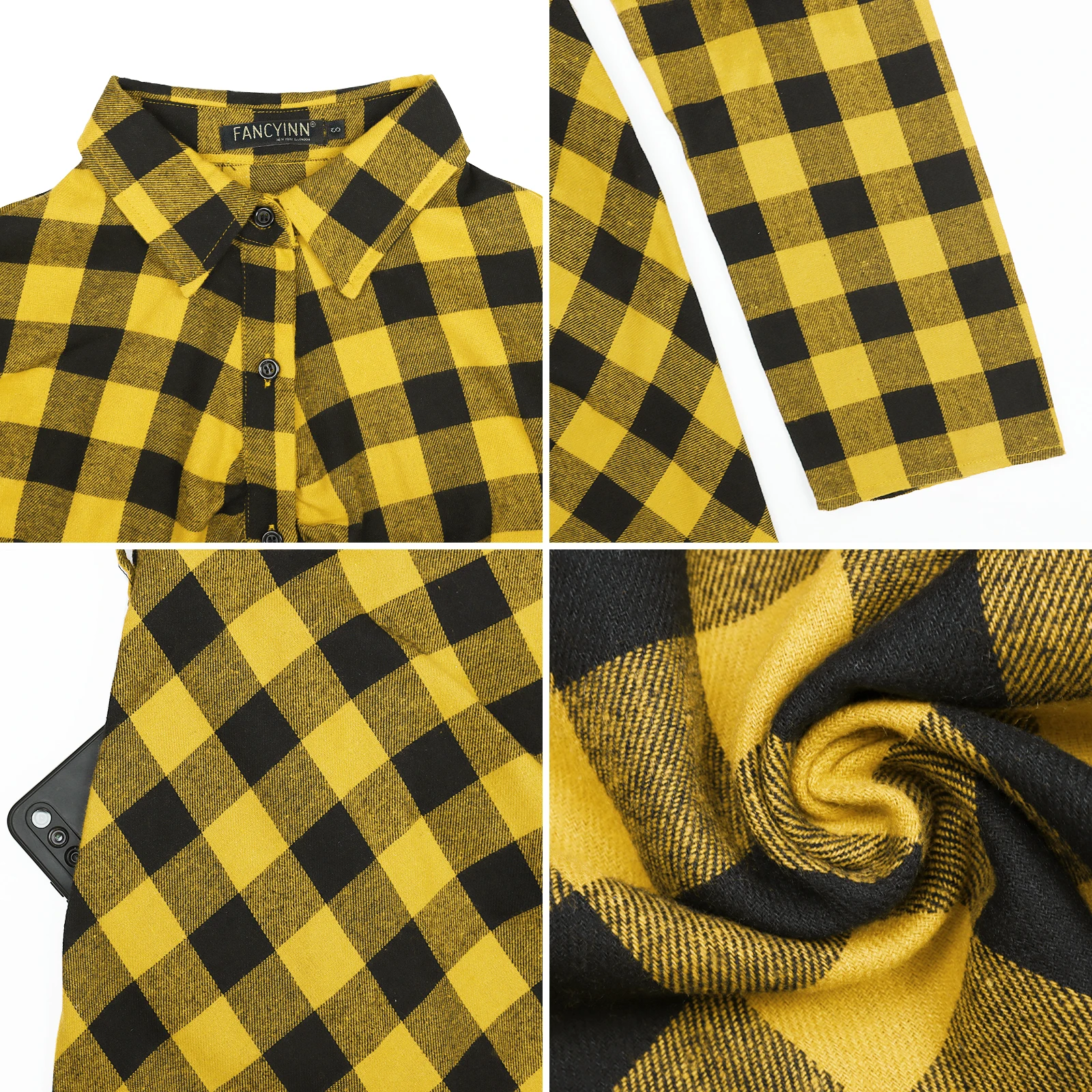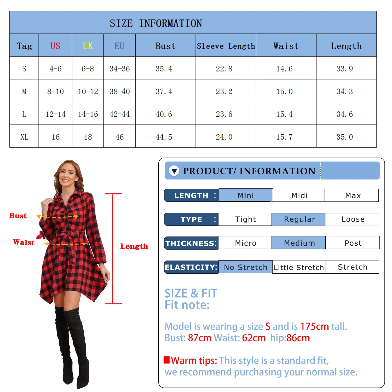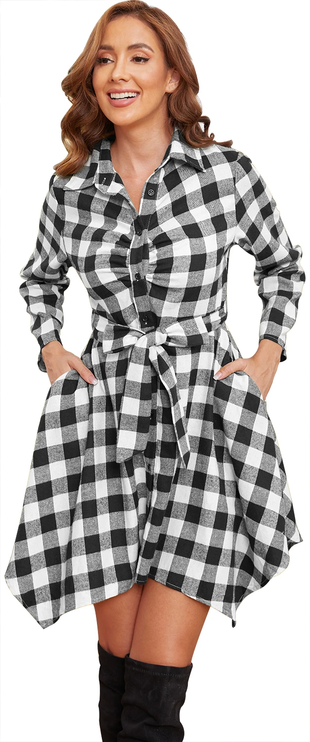 Womens Long Sleeve Checker Plaid Shirt Dress Pleated Front Chest Irregular Hem Casual Autumn /Winter Dress. S-XL